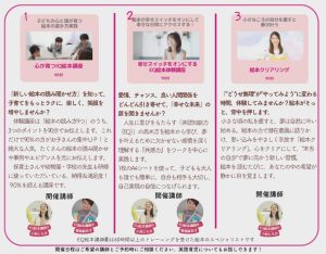 「心が育つIQ絵本講座」では、基礎的な絵本と育児観を学ぶことができます。「絵本de英語~お家で育てるグローバル~」講座では、家庭に英語を始めるための第一歩を丁寧にそして、日本語・英語絵本の基礎を知ることで、想いを伝えやすく笑顔で過ごすことが出来るコミュニケーション術を手に入れて、親子、しては家族の間まで途中のことができますます。